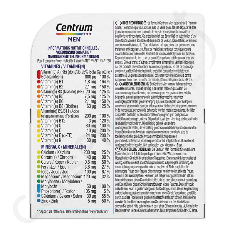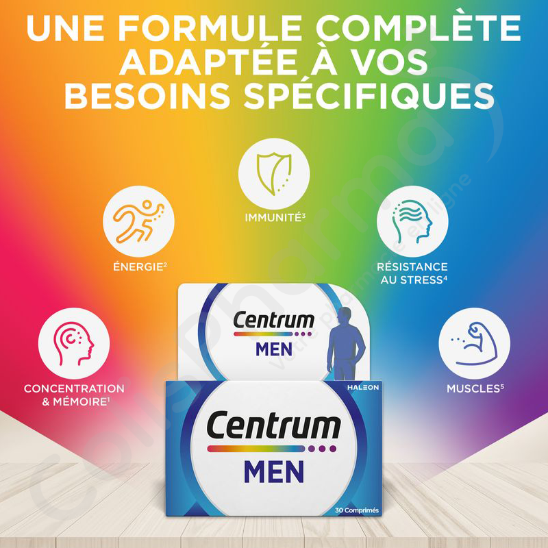 Les hommes sont différents des femmes. Les hommes sont généralement plus grands, ont plus de muscles et brûlent les calories plus rapidement. C'est pourquoi ils ont besoin de vitamines et de minéraux différents. Centrum Men a été spécialement développé et équilibré pour répondre aux besoins nutritionnels des hommes.