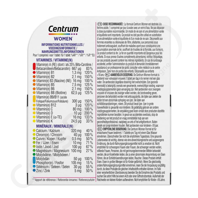 Centrum Women est sans gluten, sans lactose et convient aux diabétiques.