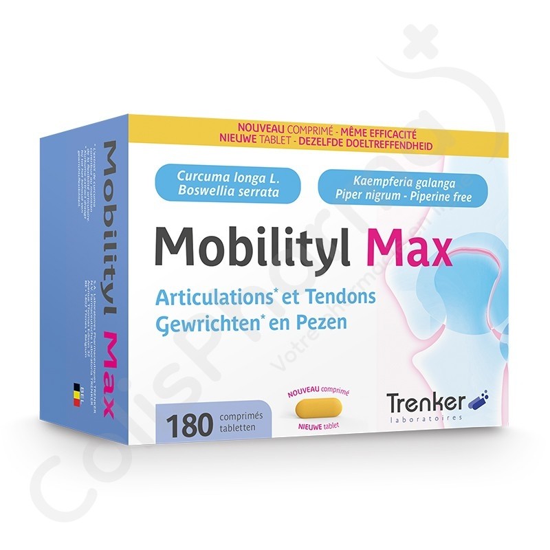 Mobilityl Max Articulations et Tendons est un complément alimentaire naturel et complet à base de curcuma, de Boswellia serrata, de Kæmpferia galanga, d'huile de poivre noir et de vitamine C, qui contribue au maintien de la flexibilité des articulations.