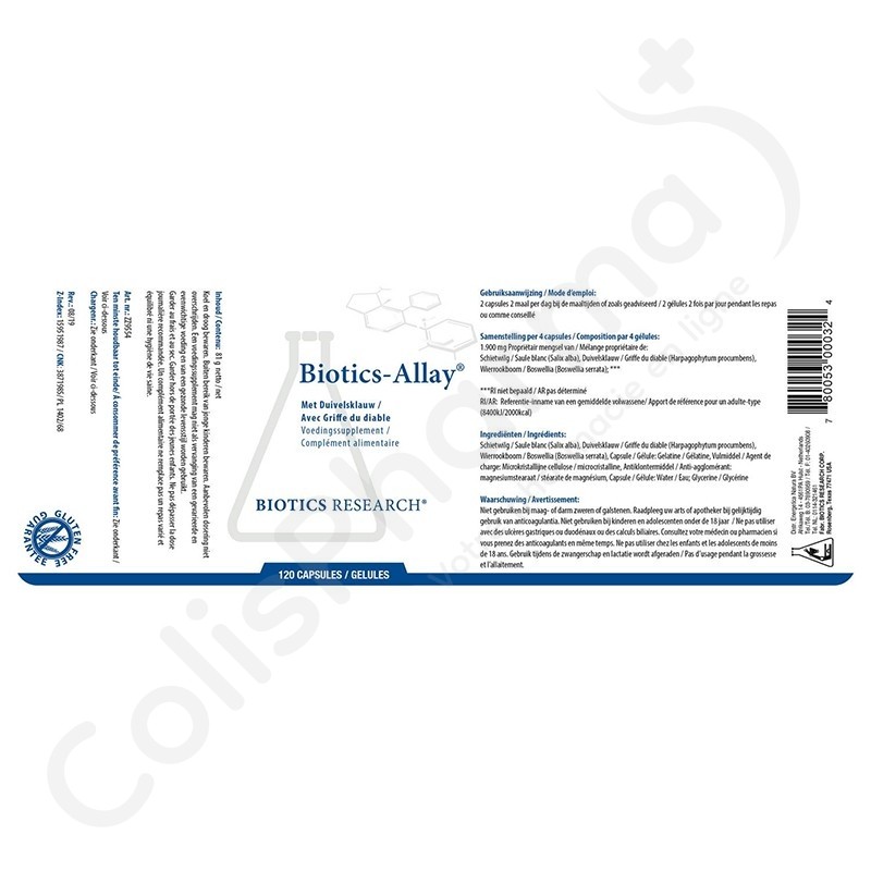 Biotics Allay est un complexe de saule blanc, griffe du diable et boswellia. Ces trois ingrédients sont reconnus pour leurs propriétés anti-inflamatoires et antidouleurs qui aident à diminuer les douleurs aux articulations.