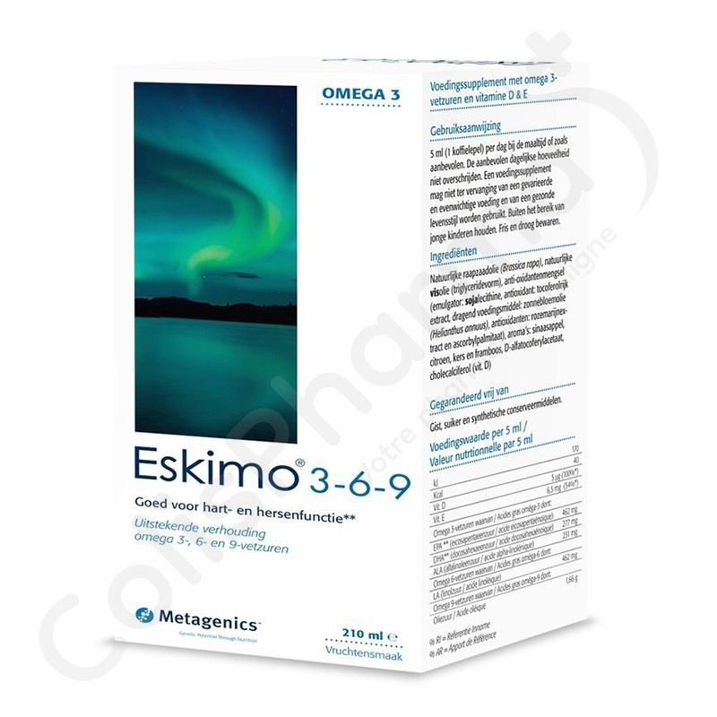 Eskimo 3-6-9 est un mélange (dans de justes proportions) des acides gras oméga-3, -6 et -9. Le rapport entre ces différents acides gras est d'une importance primordiale pour la santé. Eskimo 3-6-9 optimise ce rapport entre les différents acides gras.