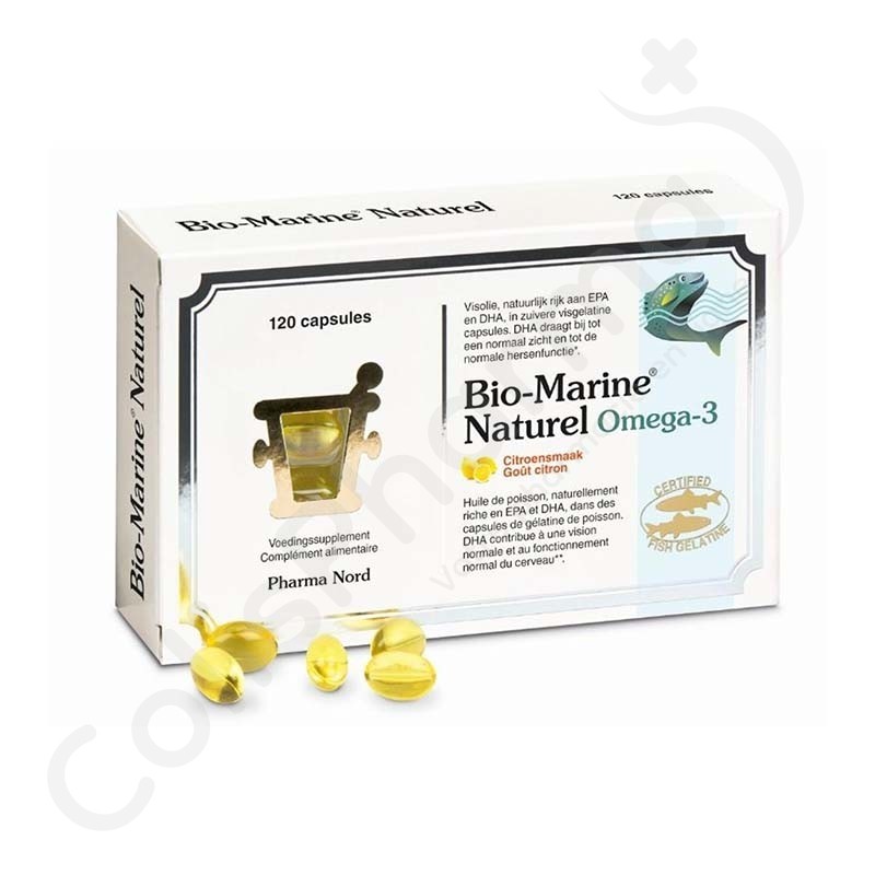 Bio-Marine Naturel est composé à 100% de poisson. Les capsules sont composées de gélatine de poisson et les Omega3 proviennent exclusivement d'huile de poisson purifiée. Toutefois, l'arôme de citron naturel évite les odeurs et goût désagréable de poisson.