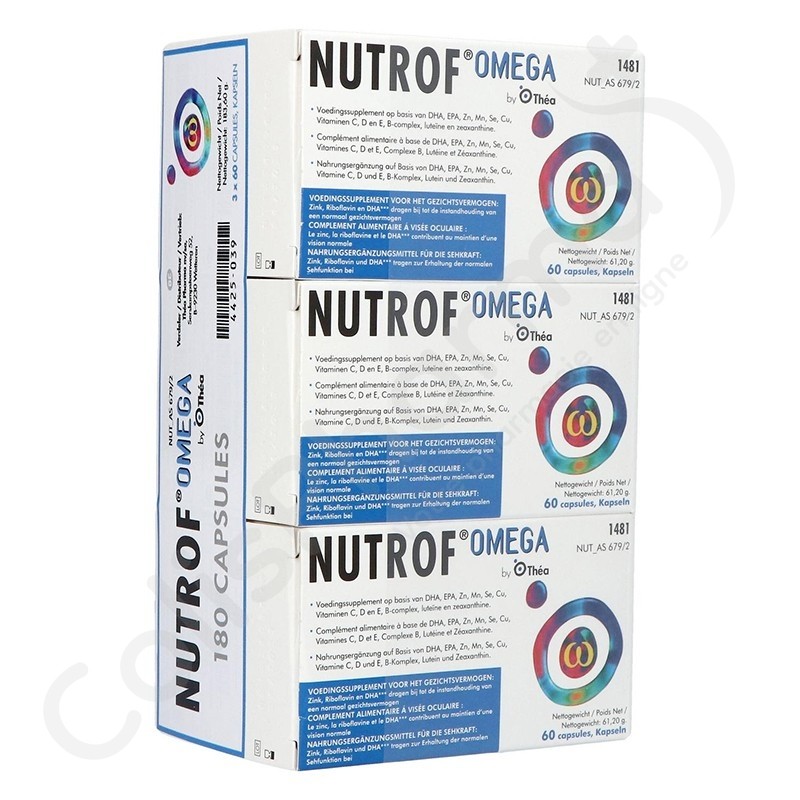Nutrof Omega est un complément alimentaire contenant des vitamines et des oligo-éléments aux propriétés antioxydantes, et des acides gras oméga qui contribuent au maintien d'une vision normale.