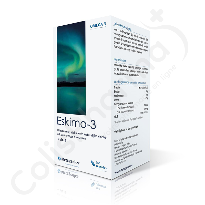 Eskimo-3 est une huile de poisson ultra pure (sous la forme de triglycérides) provenant de poissons de haute mer, mélangée à des tocophérols naturels. Eskimo-3 est un complément alimentaire contenant des acides gras, oméga-3 et de la vitamine E.