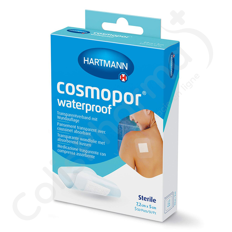 Cosmopor Waterproof est un pansement auto-adhésif stérile, non actif, non invasif, à usage unique, composé d'un matériau de support enduit d'adhésif (matériau de support) et d'une compresse, protégée par un papier siliconé, pour la protection des plaies post-chirurgicales / primaires et l'absorption de l'exsudat (plaies avec une production normale d'exsudat).