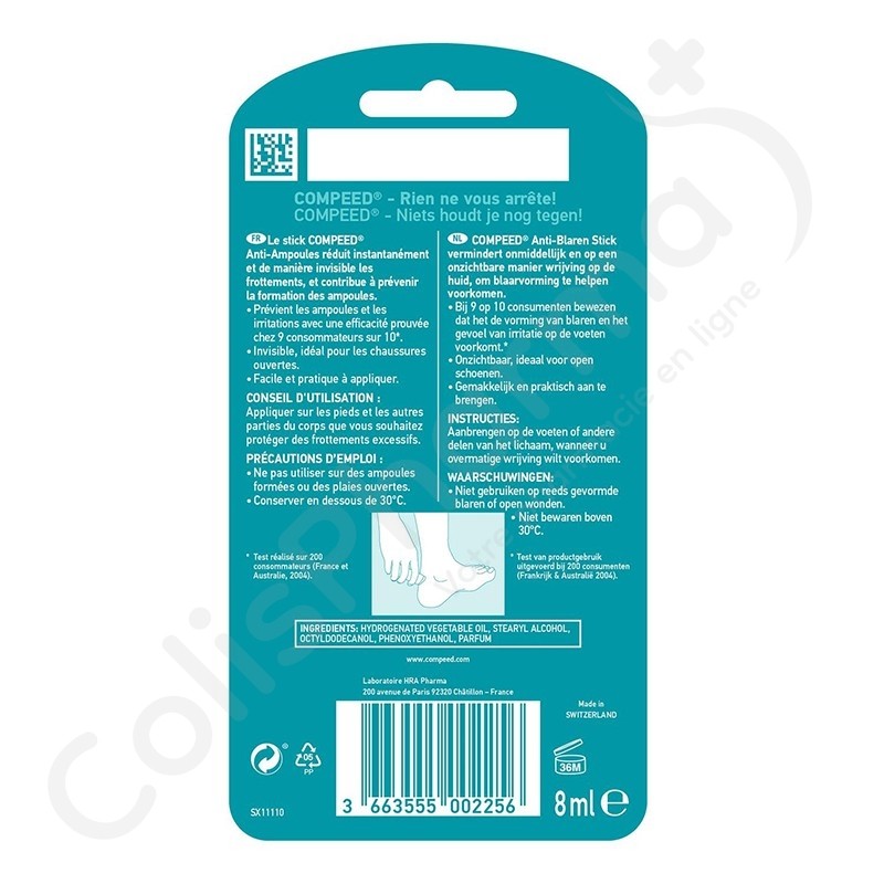 Le stick anti-ampoules Compeed est efficace pour prévenir la friction et la formation d’ampoules. Le stick peut être utilisé lors du port de nouvelles chaussures ou de longues balades pour éviter l’apparition d’ampoules. Appliquez le stick aux endroits où des frottements apparaissent afin d'éviter les ampoules. La peau est immédiatement plus lisse et la sensation de frottement disparaît.