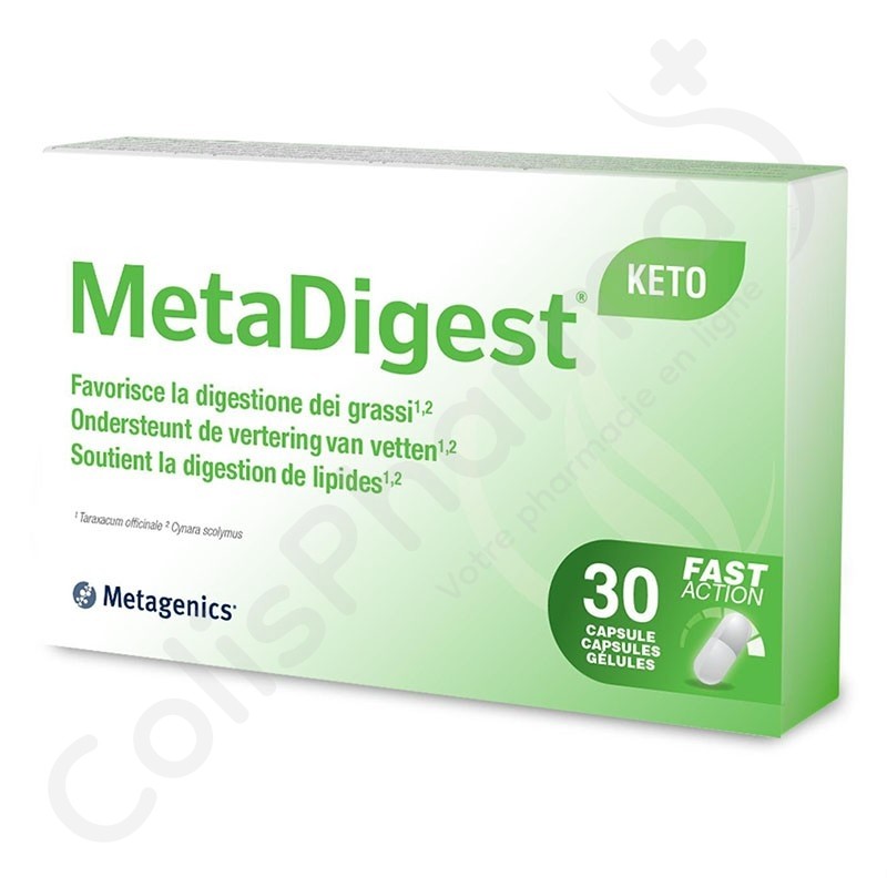 MetaDigest Keto contient un extrait de pissenlit et un extrait d'artichaut qui favorisent la digestion des lipides. En outre, l'extrait d'artichaut soutient le métabolisme des lipides.