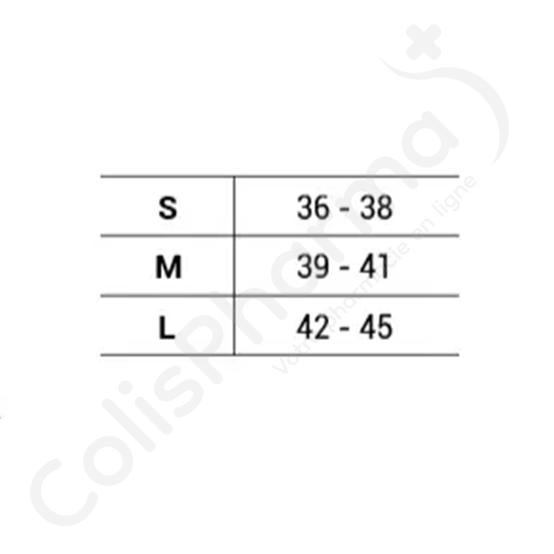 • La protection doit se porter à même la peau. Pour un maintien optimal, enfilez par-dessus un collant, un bas ou une chaussette.
