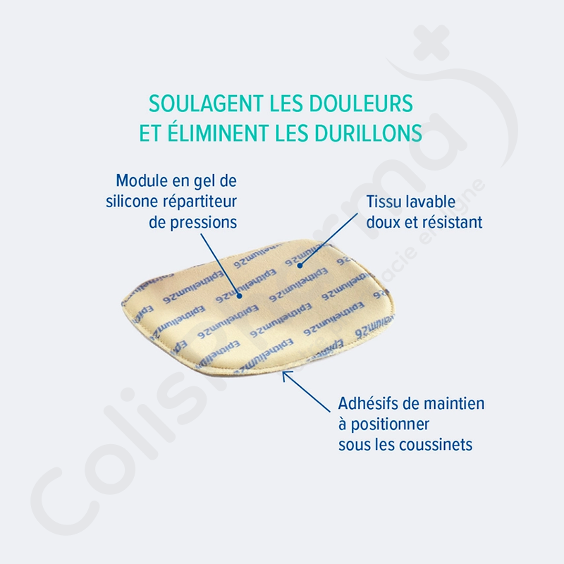 Les coussinets discrets soulagent les douleurs grâce au module en gel de silicone EPITHELIUM 26 capable de répartir le poids du corps sur l’ensemble de la zone d’appui. Ainsi, les coussinets limitent les hyperpressions douloureuses et désactivent le processus de formation de corne afin de prévenir la formation de durillons.