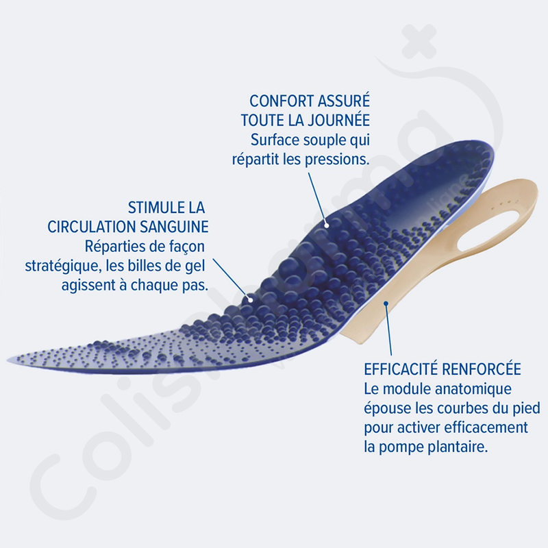 En activant la pompe plantaire à chaque pas, elles stimulent votre circulation sanguine et soulagent rapidement les symptômes tels que les jambes lourdes, les douleurs et les sensations de gonflement.