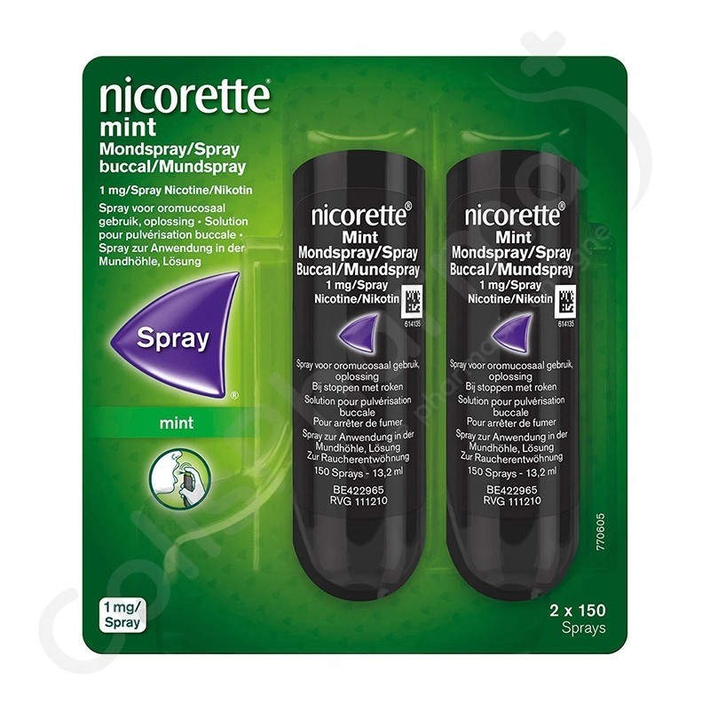 Nicorette Spray Mint duopack vous aide à arrêter de fumer. La nicotine thérapeutique ajoutée apaise votre envie de fumer en trente secondes avec seulement deux vaporisations. Le spray réprime les symptômes de sevrage tels que l'irritabilité et la diminution de l'appétit, ce qui vous permet de mieux réussir à vivre sans tabac. Nicorette Spray Mint duopack est un moyen rapide de vous débarrasser de votre envie de fumer. Les deux sprays Nicorette remplacent jusqu'à 300 cigarettes. Le goût de menthe assure une haleine fraîche.
