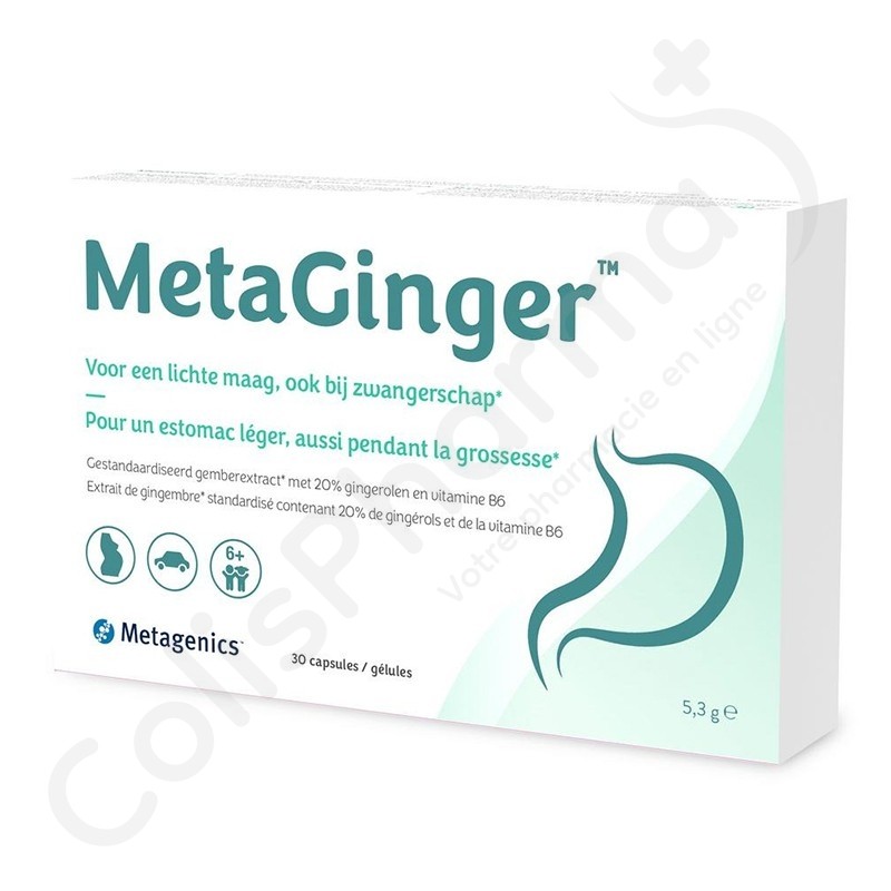 MetaGinger, hautement dosé d'un extrait de gingembre, soutient le système digestif, par exemple pendant le voyage (dans les transports) ou pendant la grossesse. MetaGinger aide aussi en cas de léthargie, grâce à la vitamine B6.