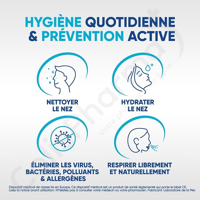 Hygiène nasale préventive : pulvériser dans chaque narine 1 à 2 fois par jour