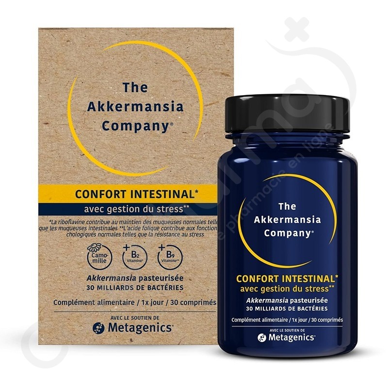 Akkermansia Company Confort Intestinal contient de la riboflavine qui contribue au maintien des muqueuses normales telles que les muqueuses intestinales. L'acide folique contribue aux fonctions psychologiques normales telles que la résistance au stress.