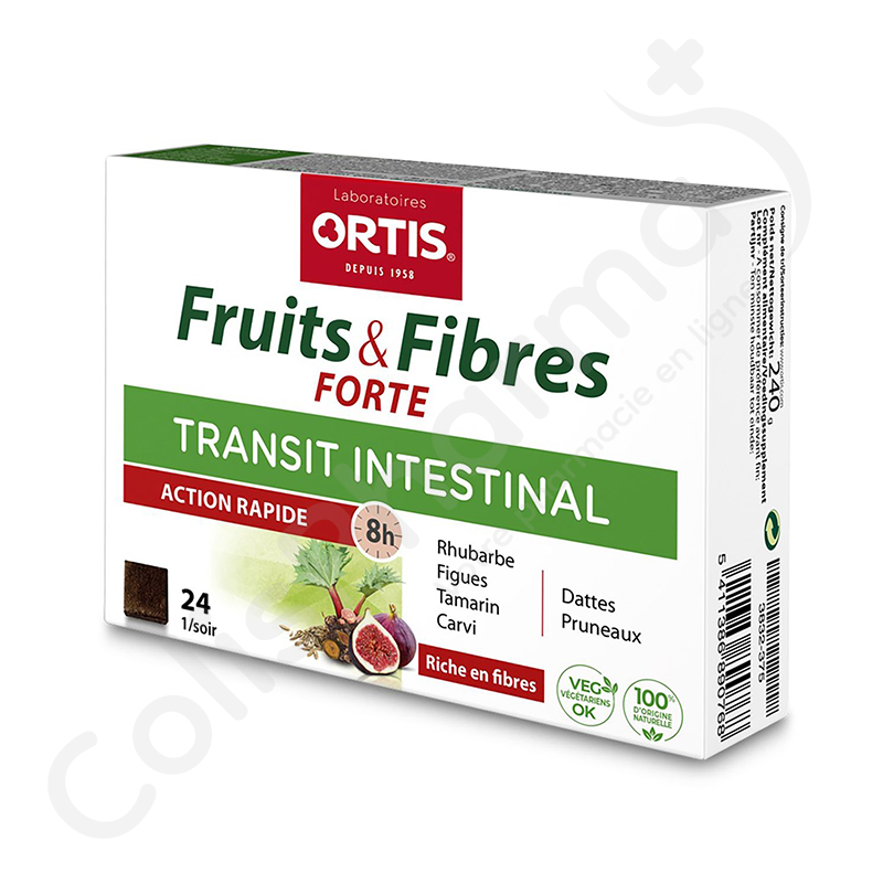 Ortis Fruits & Fibres Forte Transit Intestinal est un complément alimentaire à base de rhubarbe et carvi :