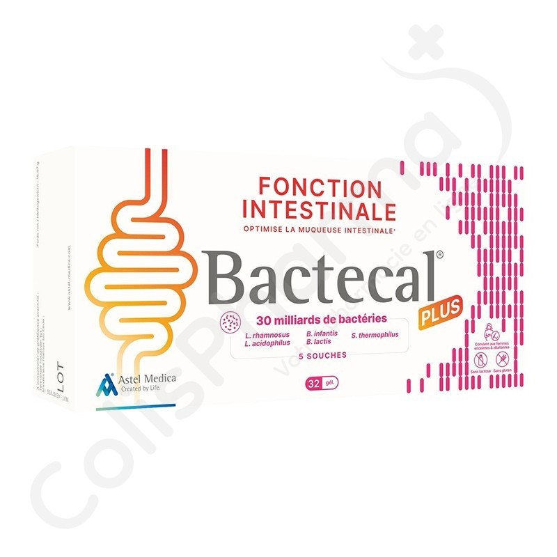 Bactecal Plus contient 30 milliards de bactéries venant de 5 souches (Lactobacillus rhamnosus, Lactobacillus acidophilus, Bifidobacterium infantis, Bifidobacterium lactis et Streptococcus thermophilus) issues de 3 familles (Lactobacillus, Bifidobacterium et Streptococcus). La composition unique de Bactecal PLUS permet d'optimiser la fonction intestinale.