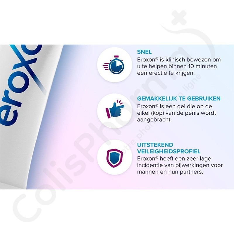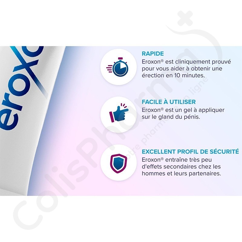 Eroxon est un dispositif médical qui traite le dysfonctionnement érectile. Grâce à son fonctionnement spécifique, il aide à obtenir une érection en moins de 10 minutes. Ce gel topique facilite l'intimité et inclus le partenaire pour une expérience sexuelle plus spontanée. Cliniquement prouvé, Eroxon est bien toléré et apporte une efficacité globale à long terme. Eroxon® stimule la circulation sanguine dans le pénis grâce à un effet physique unique de refroidissement puis de réchauffement, vous aidant à obtenir et à maintenir une érection suffisamment dure pour les rapports sexuels. Eroxon® ne vous aidera à avoir une érection que si vous êtes sexuellement excité (stimulé).