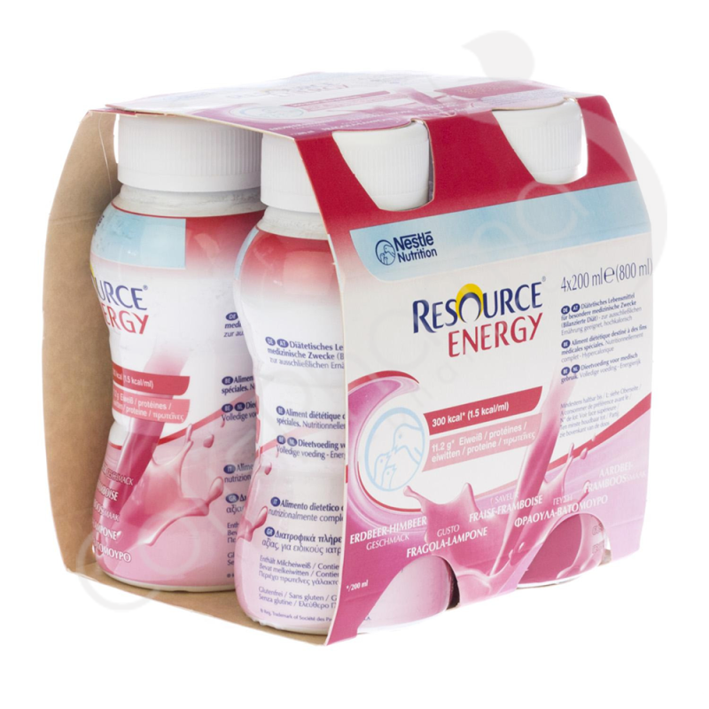 Resource Energy Drink Fraise-Framboise est un aliment buvable prêt à l'emploi, hypercalorique (1,5 kcal/ml) complémentaire à base de lait. Une bouteille de Resource Energy Drink Fraise-Framboise contient 200 ml et est disponible goût fraise-framboise.