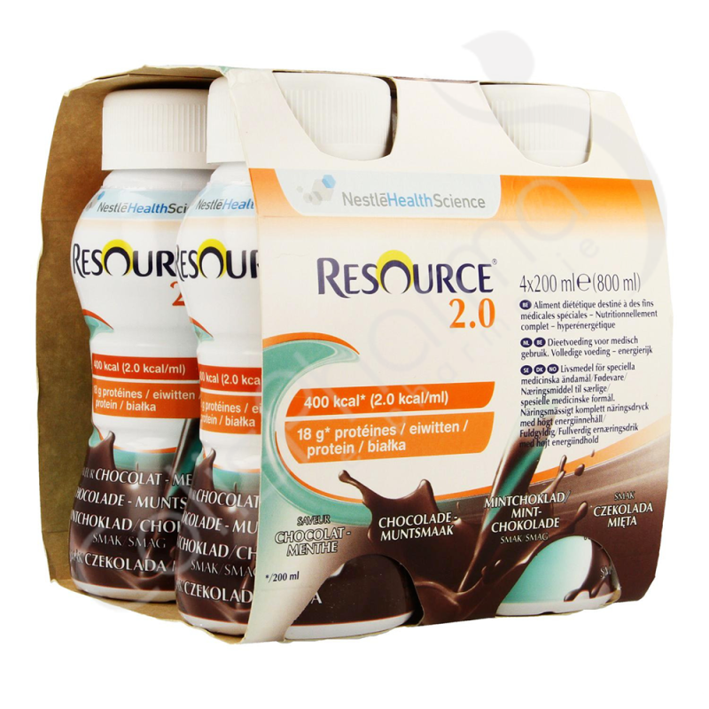 Resource 2.0 Chocolat-Menthe est un aliment buvable prêt à l'emploi, hypercalorique complémentaire à base de lait. Une bouteille de Resource 2.0 contient 200 ml et est disponible goût Chocolat-Menthe.