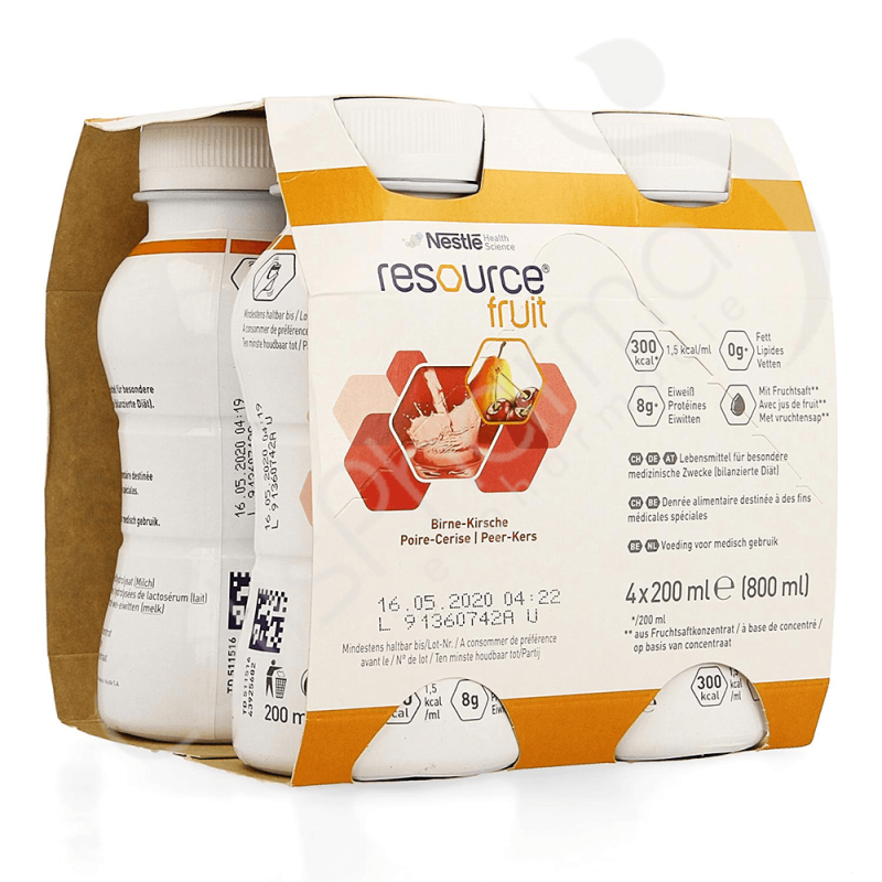 Resource Fruit Poire/Cerise est un aliment buvable complet prêt à l'emploi, hypercalorique (1,5 kcal/ml) complémentaire à base de concentré de jus de fruit. Une bouteille de Resource Fruit Poire/Cerise contient 200 ml et est disponible goût Poire/Cerise.