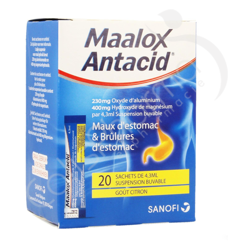 Fiche technique - Maalox Antacid Goût Citron 230 mg/400 mg - 20 sachets de 4,3 ml