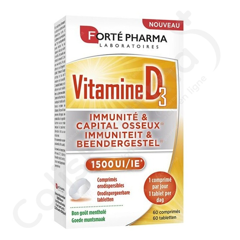Afin de contribuer au fonctionnement normal du système immunitaire et au maintien d'une ossature normale, les laboratoires Forté Pharma ont développé Vitamine D3 1500 UI, de la vitamine D3 issue de lanoline. Sans sucre ni édulcorants, sans gluten, les comprimés orodispersibles de la vitamine D3 1500 UI, au bon goût menthe, fondent rapidement sur la langue pour une assimilation rapide.