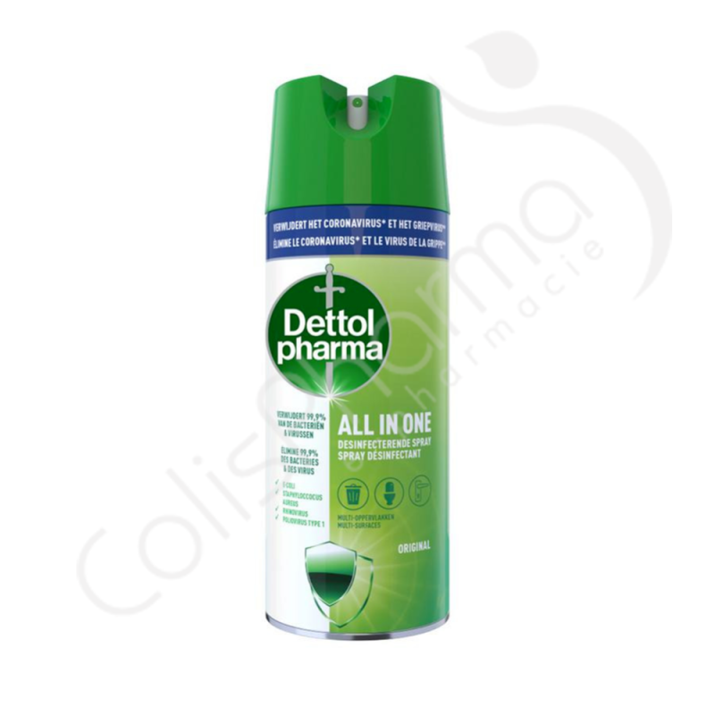 Dettolpharma All In One est un spray désinfectant qui élimine 99,9% des bactéries et virus dont notamment :