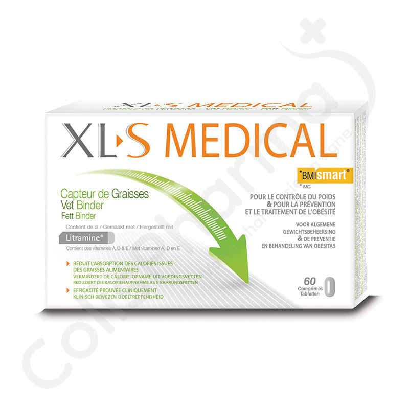 XLS Medical Capteur de Graisses est un dispositif médical certifié destiné au contrôle du poids, fabriqué à base d'un complexe unique et standardisé de fibres (Litramine), composé notamment de feuilles de cactus déshydratées. Le produit est enrichi en vitamines essentielles liposolubles A, D et E afin de compenser la disponibilité réduite de ces vitamines due à l'absorption des graisses.