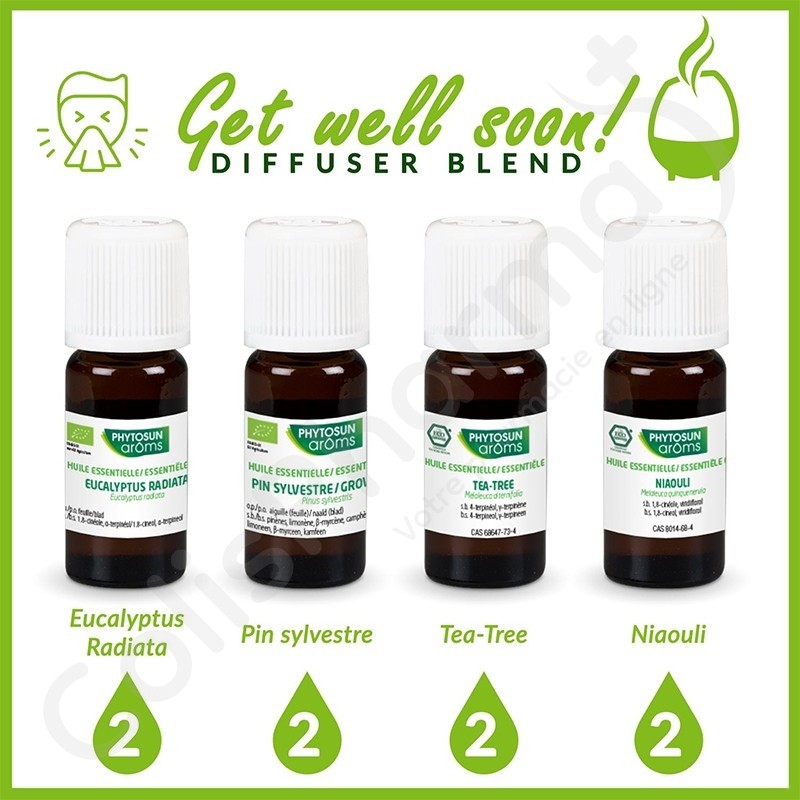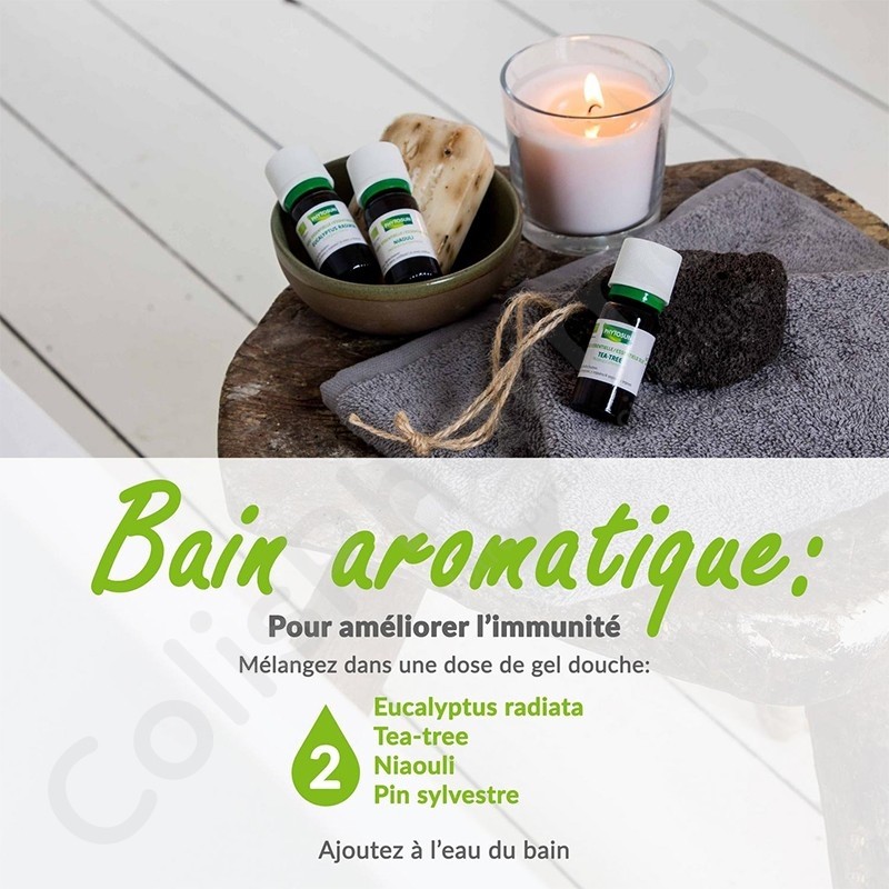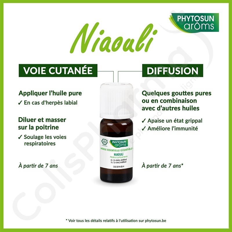 L'huile essentielle Phytosun Niaouli dégage les voies respiratoires inférieures en cas d’encombrement et aide donc à mieux respirer. Elle soigne également les boutons de fièvre, purifie et nettoie la peau. Phytosun Niaouli aide à se remettre d'un état grippal et améliore l'immunité.
