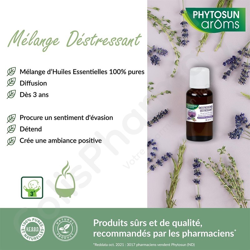 Phytosun Complexe Déstressant a été spécialement développé pour créer une atmosphère relaxante, détendue et positive. Le Complexe Déstressant Phytosun est composé de plusieurs huiles aux multiples vertus :