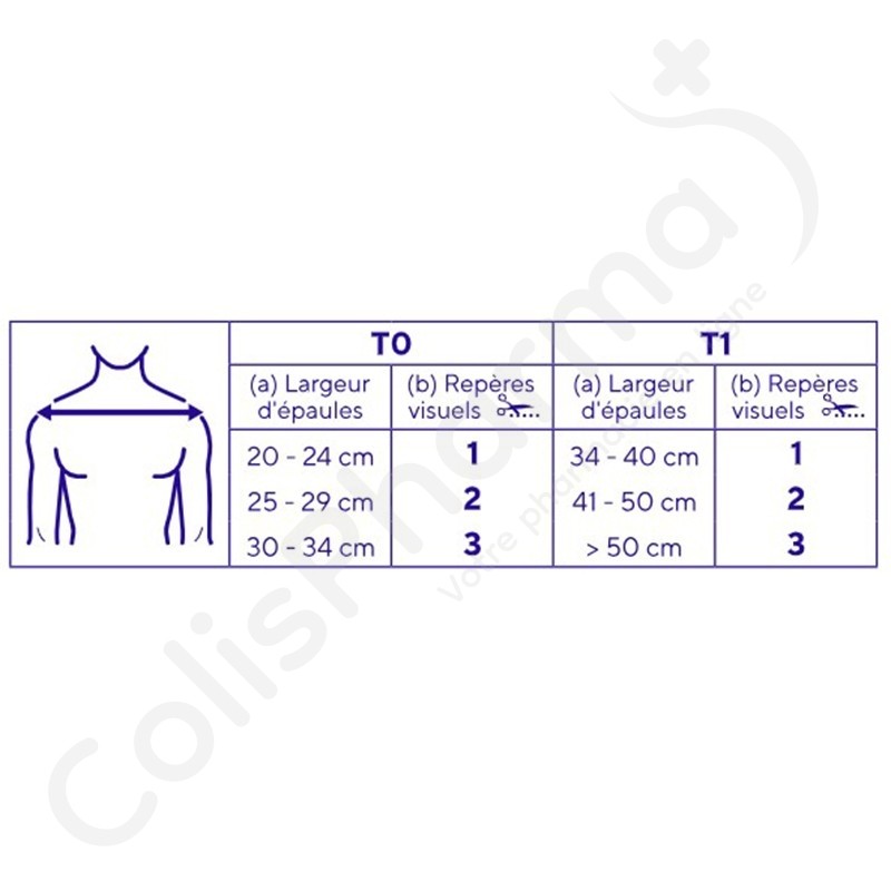 Retirer les auto-agrippants amovibles du bout des sangles puis les découper selon la largeur d'épaules de la personne, au niveau du repère visuel correspondant. Enfin replacer les auto-agrippants amovibles aux extrémités des sangles.