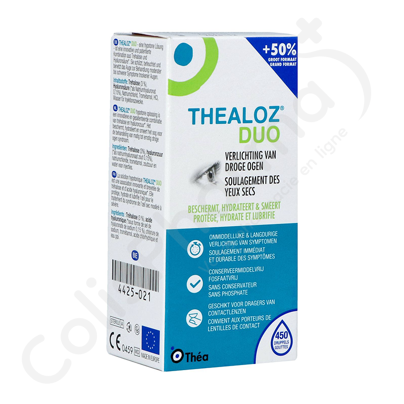 Thealoz Duo Gouttes sont des gouttes pour les yeux pour la protection, l´hydratation et la lubrification de la surface oculaire indiquée pour le traitement du syndrome de l´oeil sec modéré à sévère.