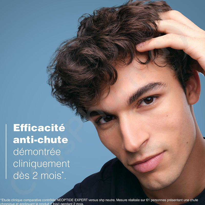 ¹Etude clinique comparative contrôlée NEOPTIDE EXPERT versus shp neutre. Mesure réalisée sur 61 personnes présentant une chute chronique et appliquant le produit 1 fois/j pendant 2 mois ²% de satisfaction. Etude d'usage réalisée sur 137 sujets présentant une chute de cheveux chronique