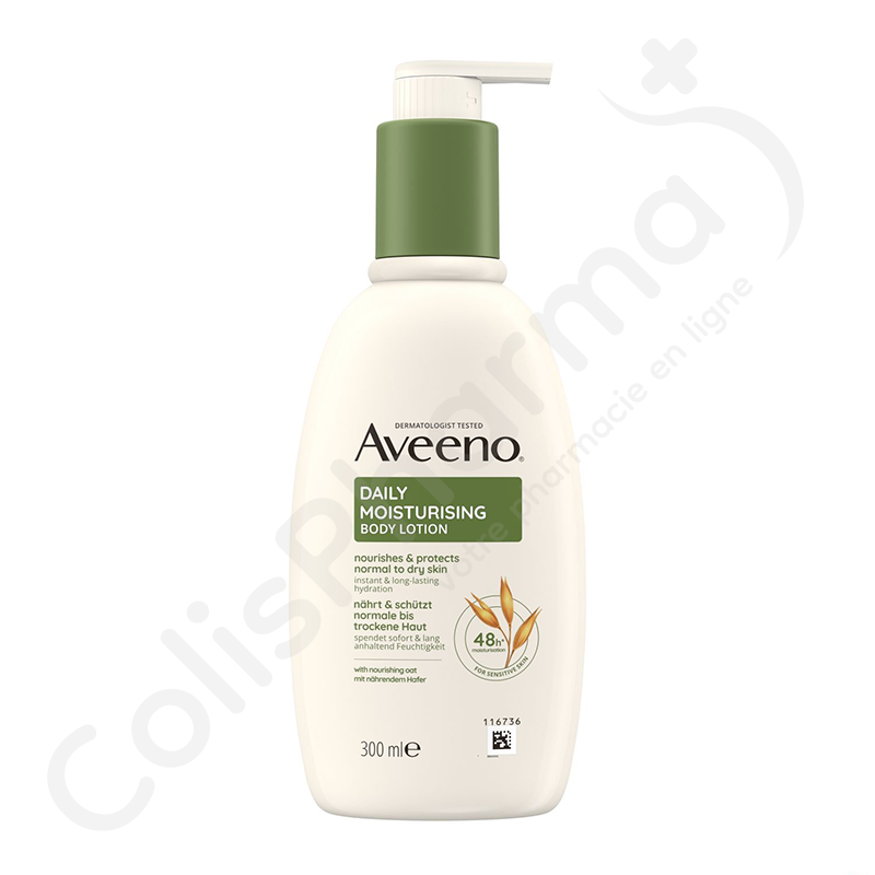 Aveeno Daily Moisturizing Lotion du corps hydrate intensément la peau sèche pendant 24 heures et est absorbée en quelques secondes. À base d'avoine apaisante, sa formule sans parfum nourrit la peau avec une sensation légère et respirante. Cette formule d'avoine prébiotique retient l'humidité pour nourrir et aider à améliorer la barrière d'hydratation naturelle de la peau.
