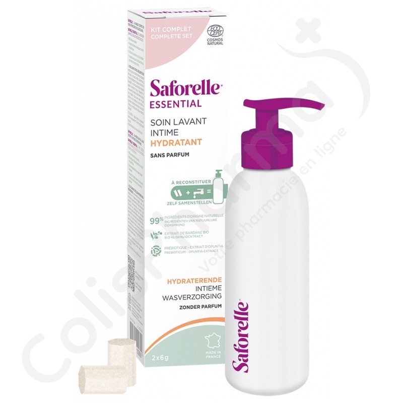Saforelle Soin Lavant Intime Hydratant est un kit à reconstituer avec 1 Flacon + 2 Bâtonnets, conçu pour la toilette intime et corporelle des peaux normales à sèches. Sa formule, à l'extrait de Bardane et enrichie en extrait d'Opuntia, un prébiotique d'origine naturelle, apaise les sensations de tiraillements et hydrate tout en respectant et préservant l'équilibre de la flore intime. Ce soin intime, grâce à sa formulation douce, maintient le film hydrolipidique de la peau. Il protège ainsi la zone intime au quotidien, apaise les sensations d'inconfort et procure une sensation de fraîcheur.