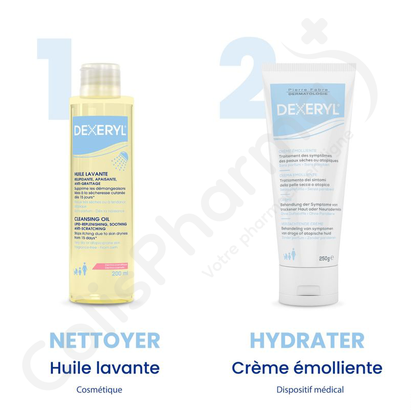 Les peaux sèches ou atopiques peuvent être irritées par les savons et l'eau. L'huile lavante DEXERYL est spécialement conçue pour nettoyer en douceur, apaiser et relipider la peau sèche, très sèche ou à tendance atopique tout en préservant la barrière cutanée. Elle supprime 100% des démangeaisons , liées à la sécheresse cutanée, en 15 jours, hydrate et relipide les peaux de toute la famille. Sa formule sans parfum et sans savon est utilisable dès la naissance. Sa texture fluide est agréable à appliquer, et produit une mousse légère et douce sur la peau, facile à rincer.