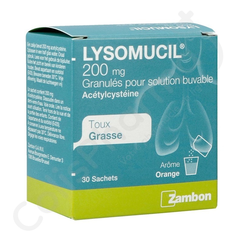 Lysomucil 200 est un médicament à base d'acétylcystéine, conseillé en cas de toux grasses. l'acétylcystéine fluidifie le mucus et soulage les bronchites chroniques et la mucoviscidose.