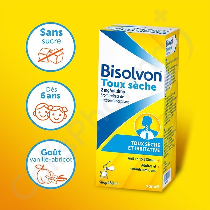 Irritative, la toux sèche est gênante et peut être soulagée par des solutions telles que Bisolvon Toux Sèche. Le sirop au goût vanille-abricot, aide à faire stopper la toux. Testez son efficacité et soyez rapidement soulagé :