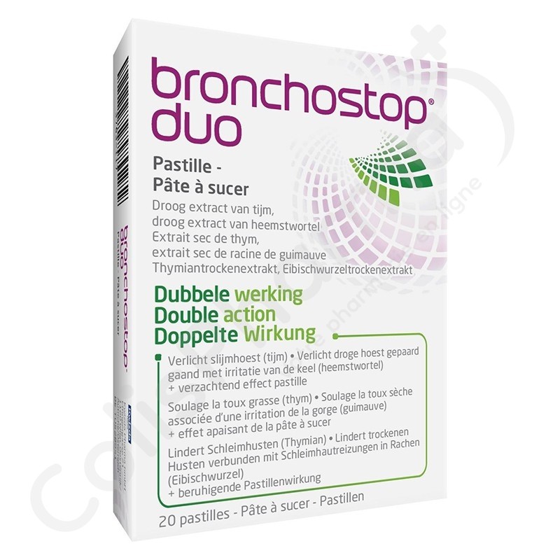 Les pastilles Bronchostop Duo à base de plantes sont utilisées pour soulager la toux productive et la toux sèche. Les principes actifs du thym favorisent l'expectoration de mucosités épaisses et apaisent les spasmes bronchiques, libérant ainsi les voies respiratoires. Les substances mucilagineuses contenues dans la racine de guimauve apaisent les irritations de la gorge et réduisent en conséquence le besoin de tousser.