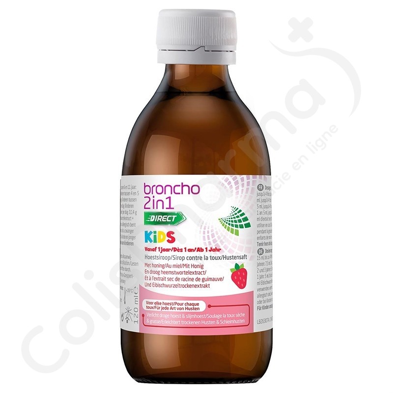 Le sirop Broncho 2 en 1 pour enfants convient au traitement de toute toux associée au rhume, qu'elle soit sèche ou muqueuse. Avec sa double action, la toux sèche est immédiatement soulagée grâce à l'extrait de racine de guimauve et le miel contenu dans le sirop assure simultanément une expectoration facile du flegme. Broncho 2 en 1 Kids est à base d'ingrédients naturels et a un agréable goût de fraise.