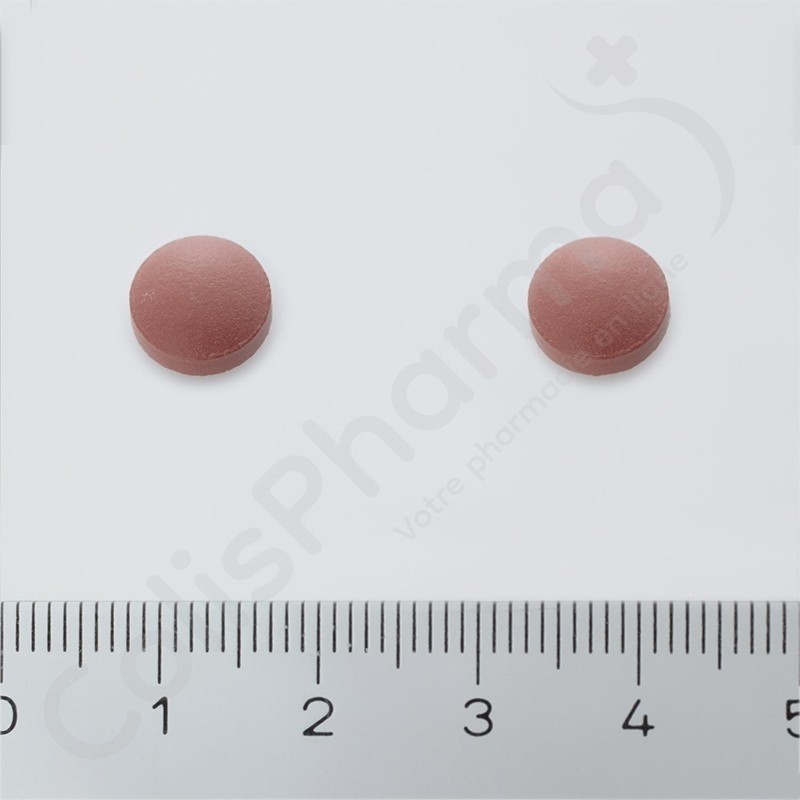 Excipients : Cellulose microcristalline, Croscarmellose sodique, Silicium dioxyde, Stéarate de magnésium, Hypromellose, Acide stéarique, Oxyde ferrique, Dioxyde de titane, Émulsion antimousse.