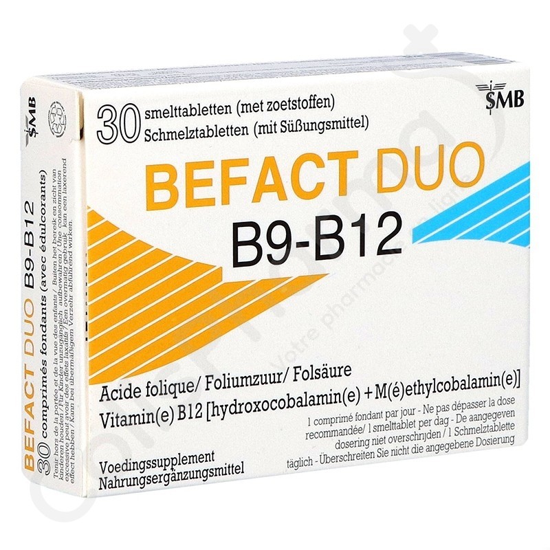 Befact Duo est un complément alimentaire à base d'acide folique et de vitamines B12 et B9 sous forme de comprimés à croquer.