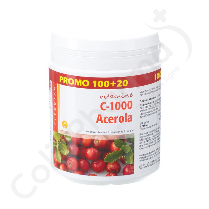 Vitamine C-1000 Acerola contient de la vitamine C qui contribue au fonctionnement normal du système immunitaire et aide à diminuer la fatigue. La vitamine C contenue dans ce complément de vitamine C qui stimule le système immunitaire provient de l'acérola (cerise antillaise) et du maïs. Les comprimés à croquer ont bon goût et conviennent également aux végétariens et aux véganes. Dites adieu à la fatigue.