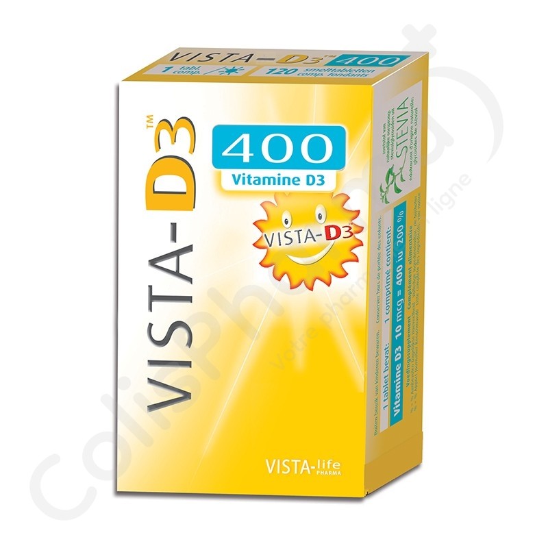 VISTA-D3 est un complément nutrionnel en vitamine D. Un comprimé fondant, facile à ingérer pour tout le monde : on peut le laisser fondre sous la langue (sublingual), le sucer, l’avaler ou le dissoudre dans l’eau !