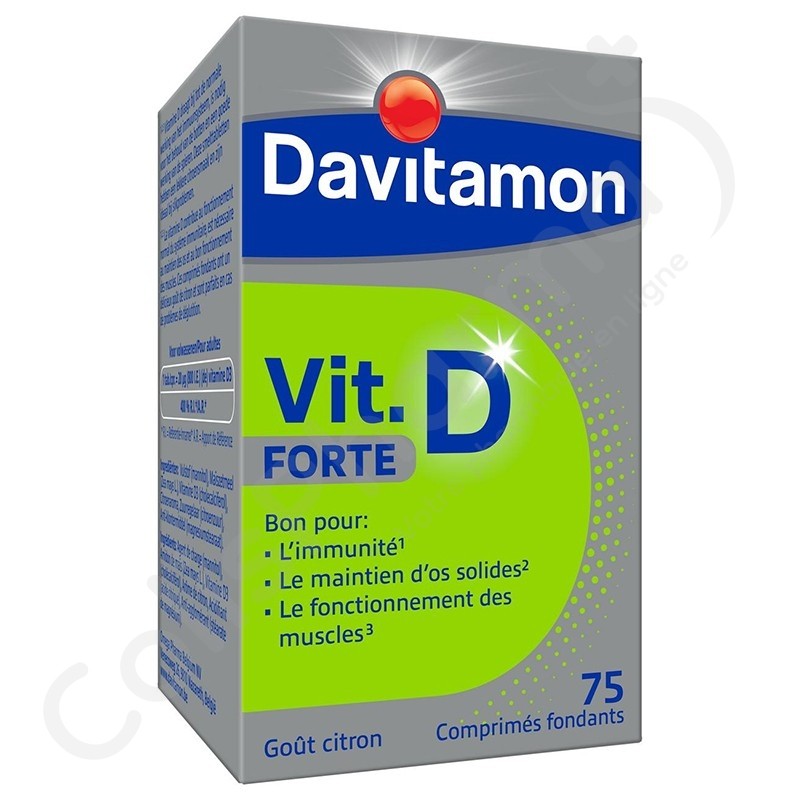 Davitamon Vitamine D Forte contribue à l'immunité ou à la résistance, au maintien d'os solides et au fonctionnement des muscles. La vitamine D maintient une absorption normale du calcium par les intestins et la fixation du calcium sur les os.
