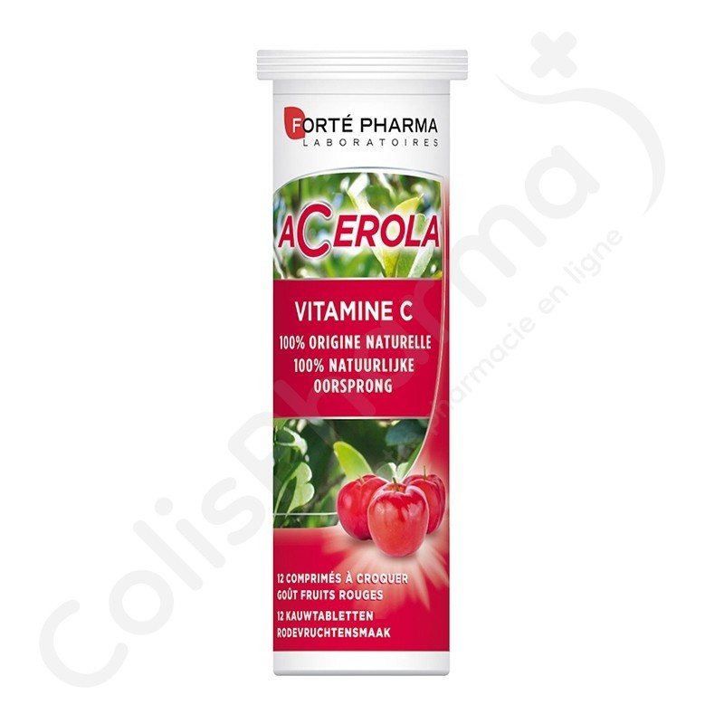 Energie Acérola contient exclusivement de la vitamine C 100% d'origine naturelle qui est utilisée pour ses propriétés tonifiantes et fortifiantes. L'acérola est une source naturelle remarquable de vitamine C qui vous en apportera 20 à 30 fois plus que l'orange. Energie Acérola vous procure tonus et vitalité tout au long de la journée avec seulement 1 comprimé à croquer par jour au très bon goût Fruits rouges.