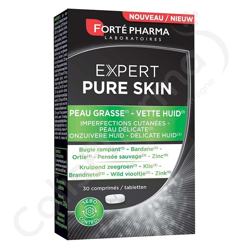 Expert Pure Skin vous aide à retrouver une peau saine. Sa formule aide à lutter contre la peau grasse et les imperfections cutanées grâce à la bardane, associée à l'ortie et à la pensée sauvage, des plantes reconnues pour contribuer à une peau nette. Elle est complétée par de la vitamine B6 qui contribue à réguler l'activité hormonale, ainsi que du bugle rampant.