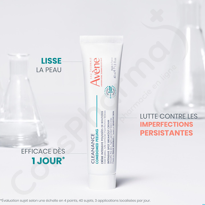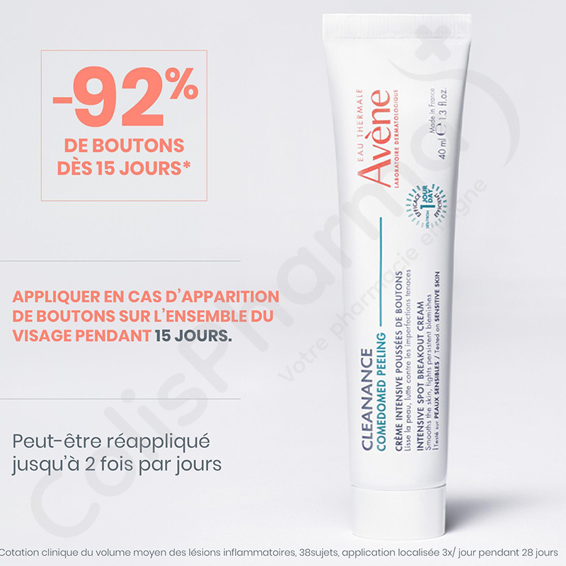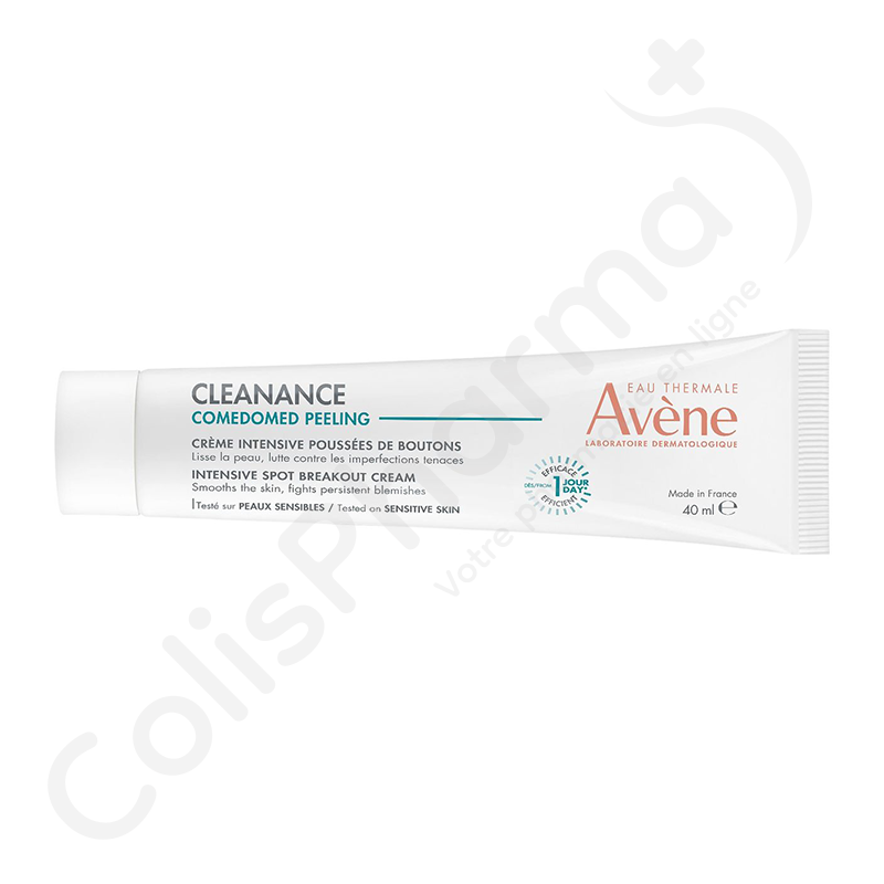 De Comedomed Peeling Cream van Avene is de nieuwe bondgenoot in de strijd tegen puistjes. Het pakt alle zichtbare onvolkomenheden van de acnegevoelige huid aan met een unieke, ultra-effectieve formule dankzij een combinatie van dermatologische actieve ingrediënten: Glycolzuur exfolieert en stimuleert de celvernieuwing voor een nieuw huideffect dankzij de keratolytische werking. Retinoid Booster bevordert de resorptie van puistjes en de vermindering van restvlekken dankzij een gepatenteerde** combinatie van Retinal, de meest effectieve vorm van vitamine A, en Comedoclastine.