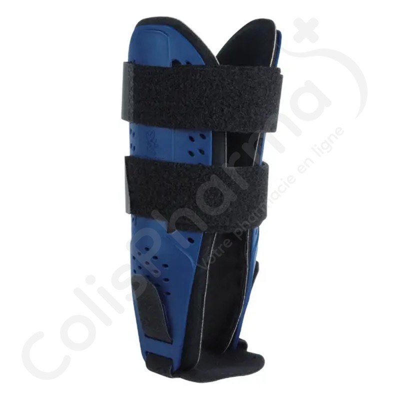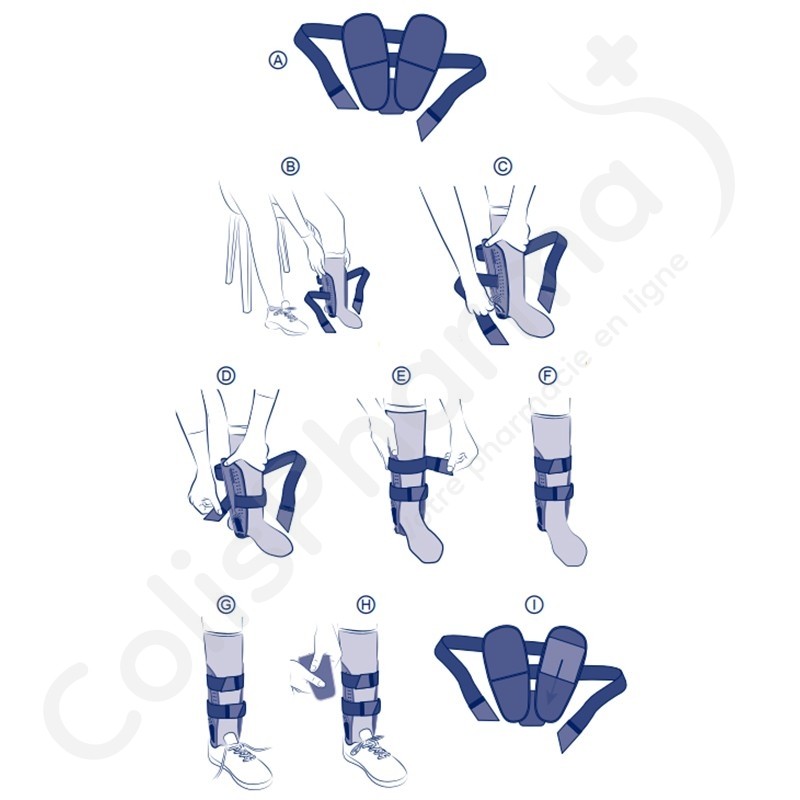 Het apparaat moet zittend worden gedragen. Het systematische gebruik van een hoge sok wordt aanbevolen tijdens het dragen van het apparaat. Het dragen van een dichte schoen wordt aanbevolen om het gewricht te helpen stabiliseren. Maak de riemen los. Plaats de enkel tussen de twee zijschalen en controleer of deze goed gecentreerd is. Pas indien nodig de breedte van de band onder de hiel aan met behulp van de klittenbandsluitingen aan de onderkant van de zijschalen. Trek de onderste riem aan en zet hem vast met de klittenbandsluitingen. Trek de bovenste riem aan en zet hem vast met de klittenbandsluitingen. Stel de riempjes bij indien nodig. Maak de schoen helemaal los. Schuif de voet met het apparaat voorzichtig in de schoen. Trek de schoen aan. Pas indien nodig de riempjes aan.