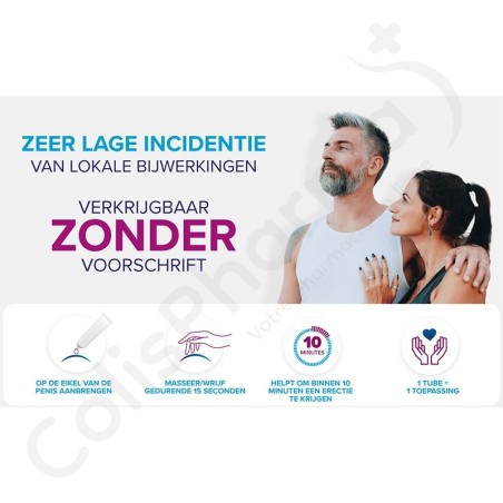 Eroxon is een medisch hulpmiddel voor de behandeling van erectiestoornissen. Het werkt specifiek om in minder dan 10 minuten een erectie te krijgen. Deze topische gel vergemakkelijkt de intimiteit en betrekt de partner voor een spontanere seksuele ervaring. Het is klinisch bewezen dat Eroxon goed wordt verdragen en langdurig werkzaam is. Eroxon® stimuleert de bloedtoevoer naar de penis door een uniek fysiek koelend en verwarmend effect, waardoor je een erectie krijgt en houdt die hard genoeg is voor geslachtsgemeenschap. Eroxon® helpt u alleen een erectie te krijgen als u seksueel opgewonden (gestimuleerd) bent.